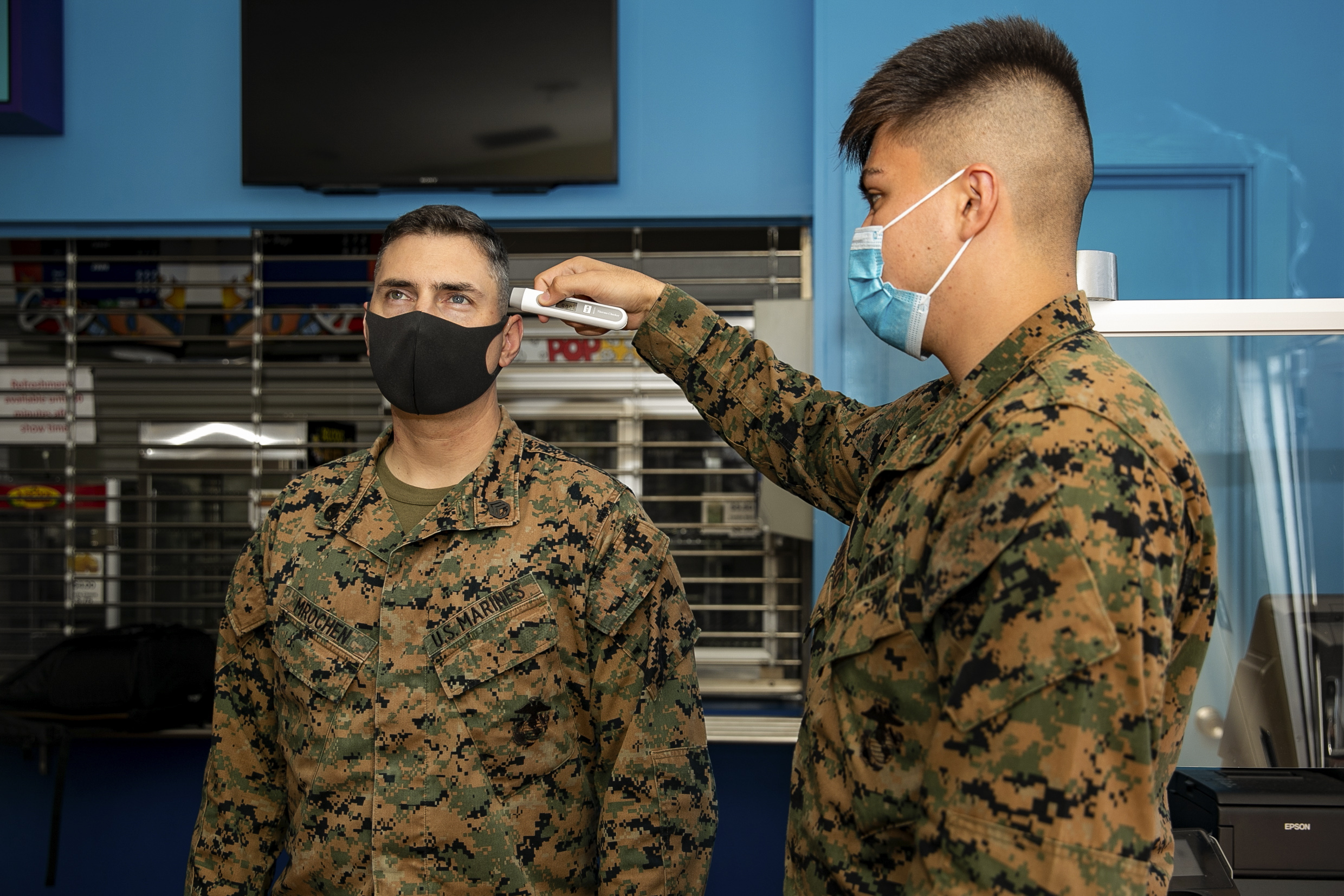 Marine Corps Cpl. Samuel Morondos takes a Marine’s temperature before attending a COVID-19 vaccination briefing at Camp Courtney in Okinawa, Japan, Jan. 26, 2020.
