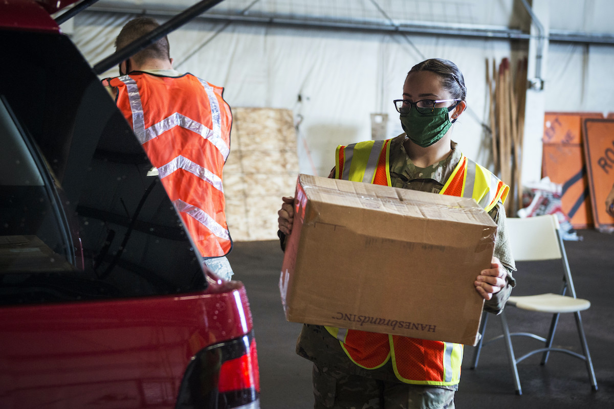 Air Force Airman 1st Class Mariel Beebe, an air transportation specialist assigned to the 103rd Logistics Readiness Squadron, loads a box of face masks into a vehicle at West Hartford Public Works in West Hartford, Conn., Sept. 30, 2020. The Connecticut National Guard is helping the Connecticut Department of Education and Division of Emergency Management and Homeland Security to distribute 600,000 masks to school districts.