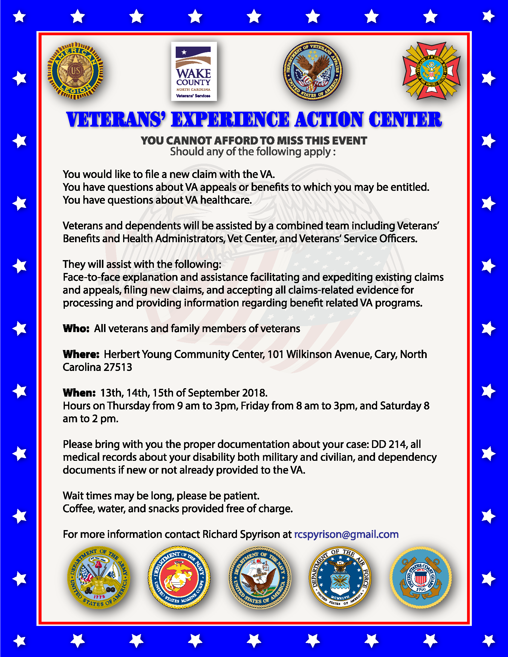 Due to Hurricane Florence, the Cary VEAC is postponed until a later date. Please check our website, https://www.benefits.va.gov/WinstonSalem/ , for updates about this and other events for Veterans in North Carolina.